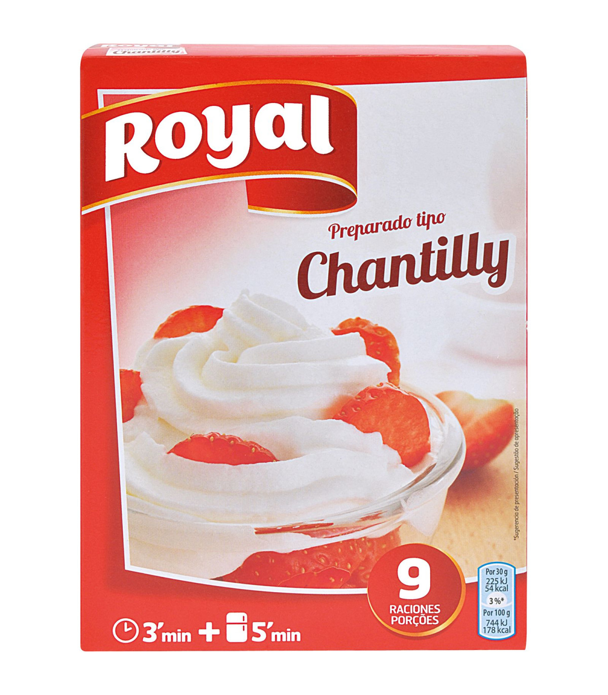 Preparación en polvo elaborada para acompañar e incorporar a toda clase postres, en esta presentación su contenido rinde para 9 raciones.