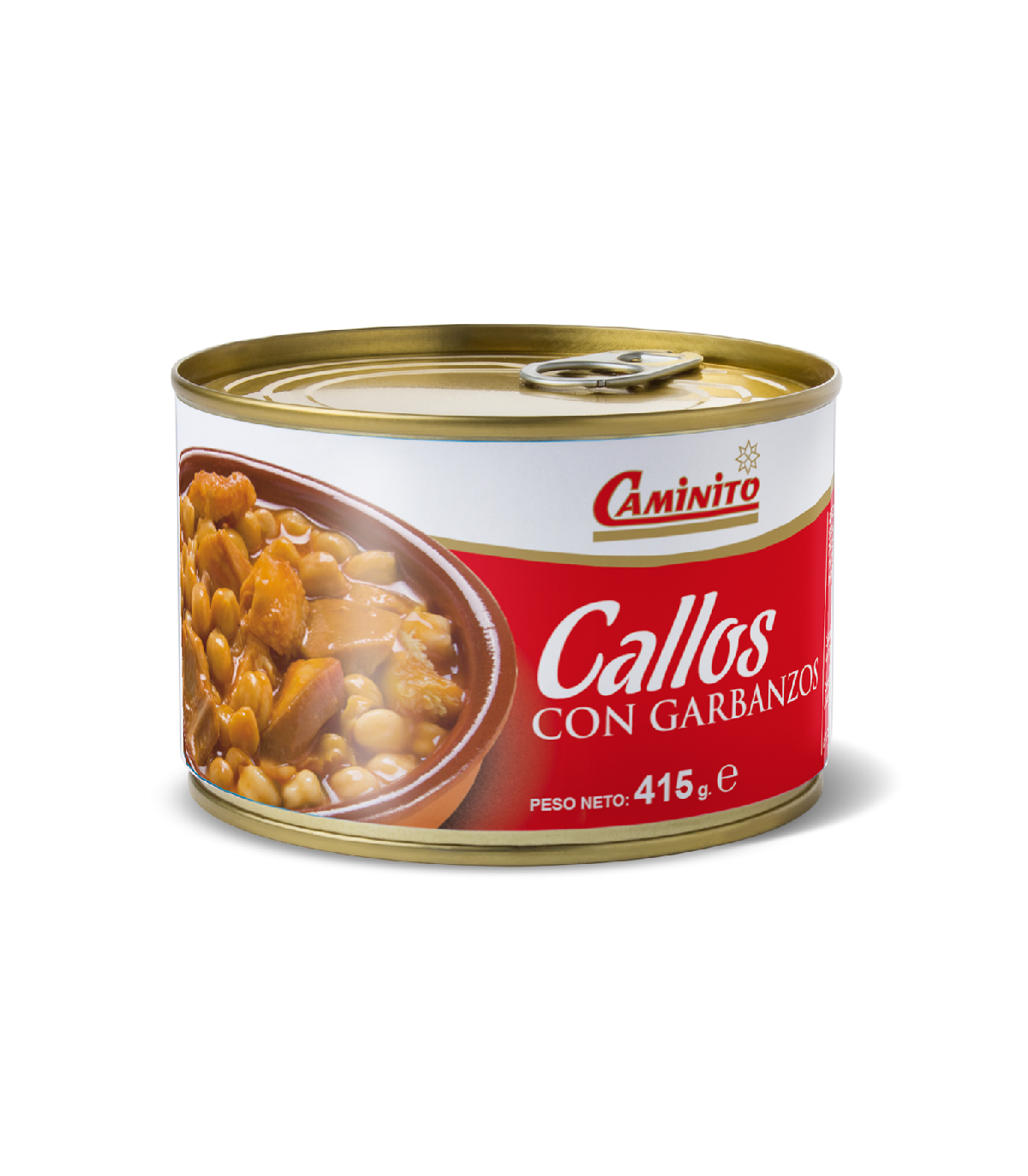 Plato cocinado en conserva. Producto sometido al proceso térmico de esterilización. Elaborado a base de callos y garbanzos.